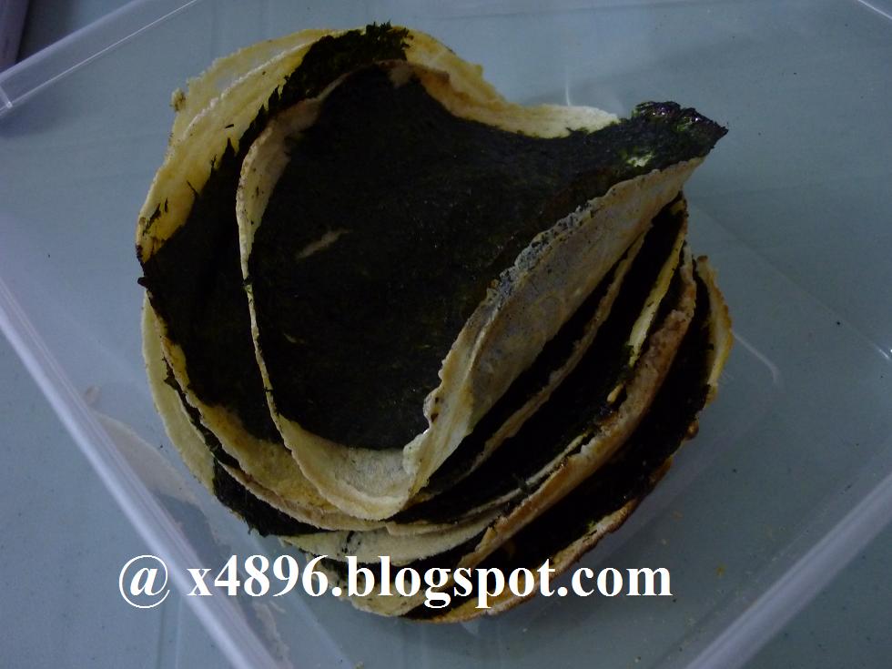 这次,恐龙只有一个人,就来不及把“情信”给折起来。我做的是全新研究的失败作品,海苔kuih kapit! 其实,这是为了我有糖尿病的父亲而做的。本来打算要放鸡丝,但是因为kuih kapit是一定要两个人做的年饼,需要有个帮手来帮我折,我自己一个人做的话,就无法来得及折了!做kuih kapit 很考验功夫的!手要快,也要有耐性,所以,传统人工做的都会卖得很贵。